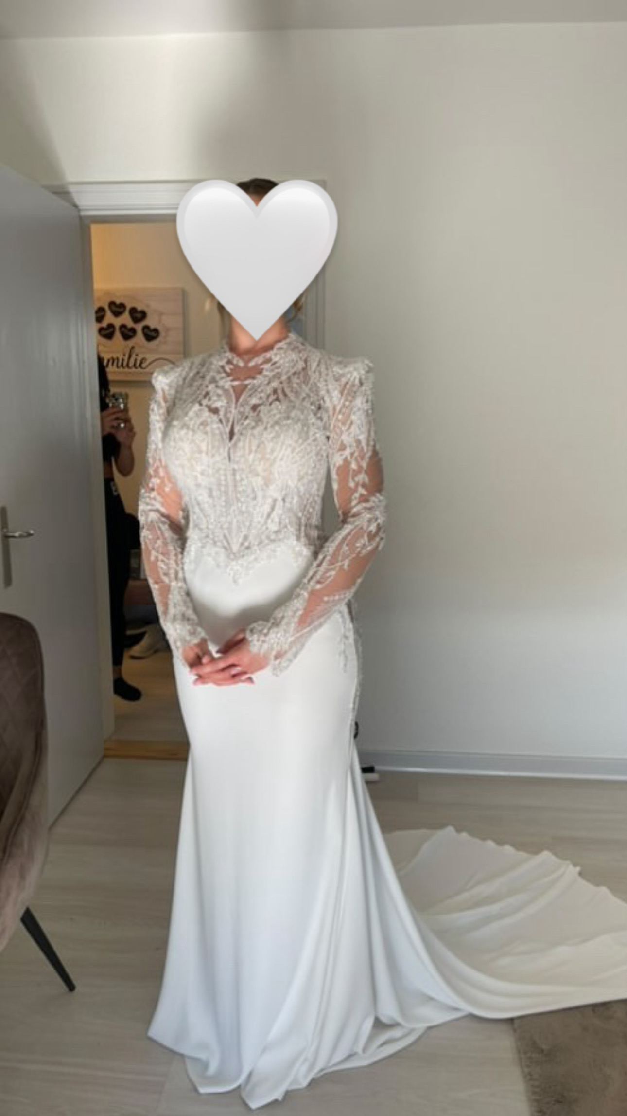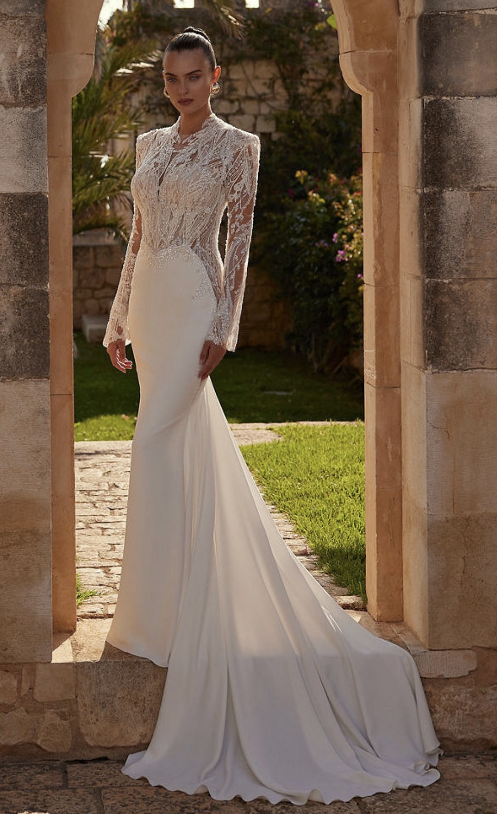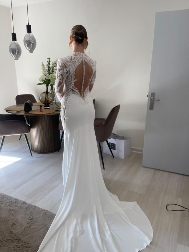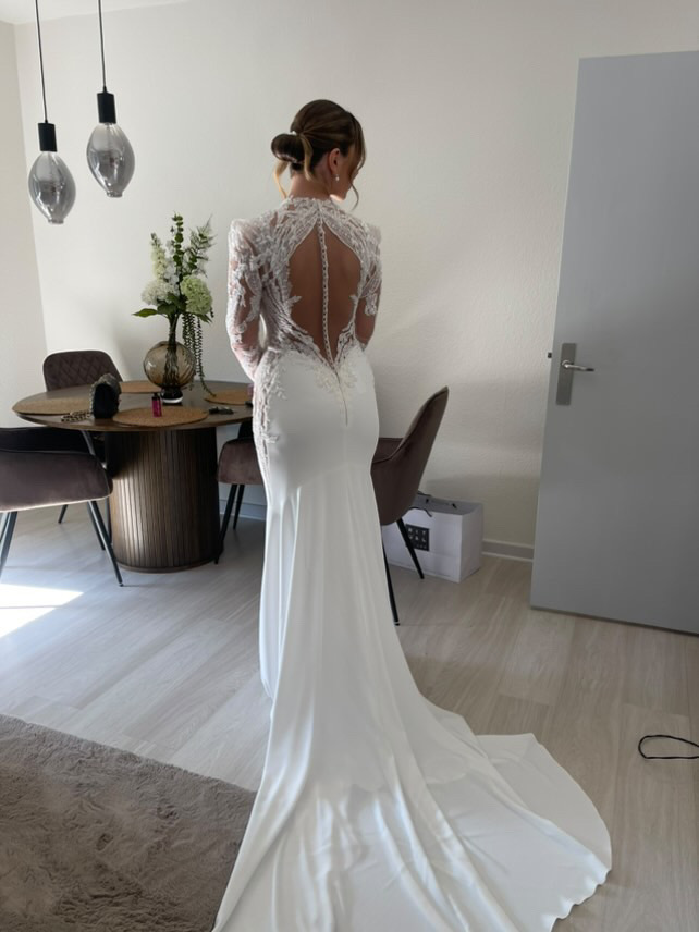 • Sleeves: Long, sheer lace sleeves for a romantic and sophisticated look