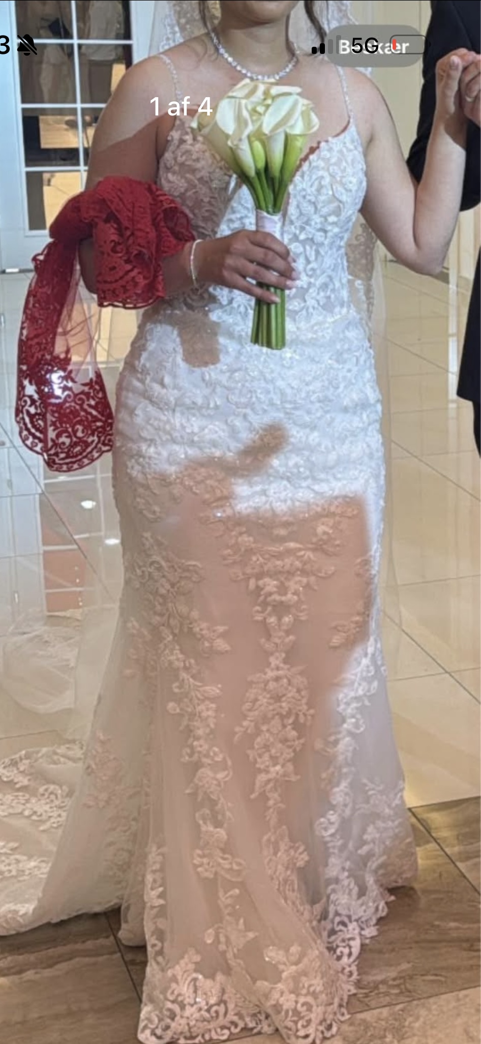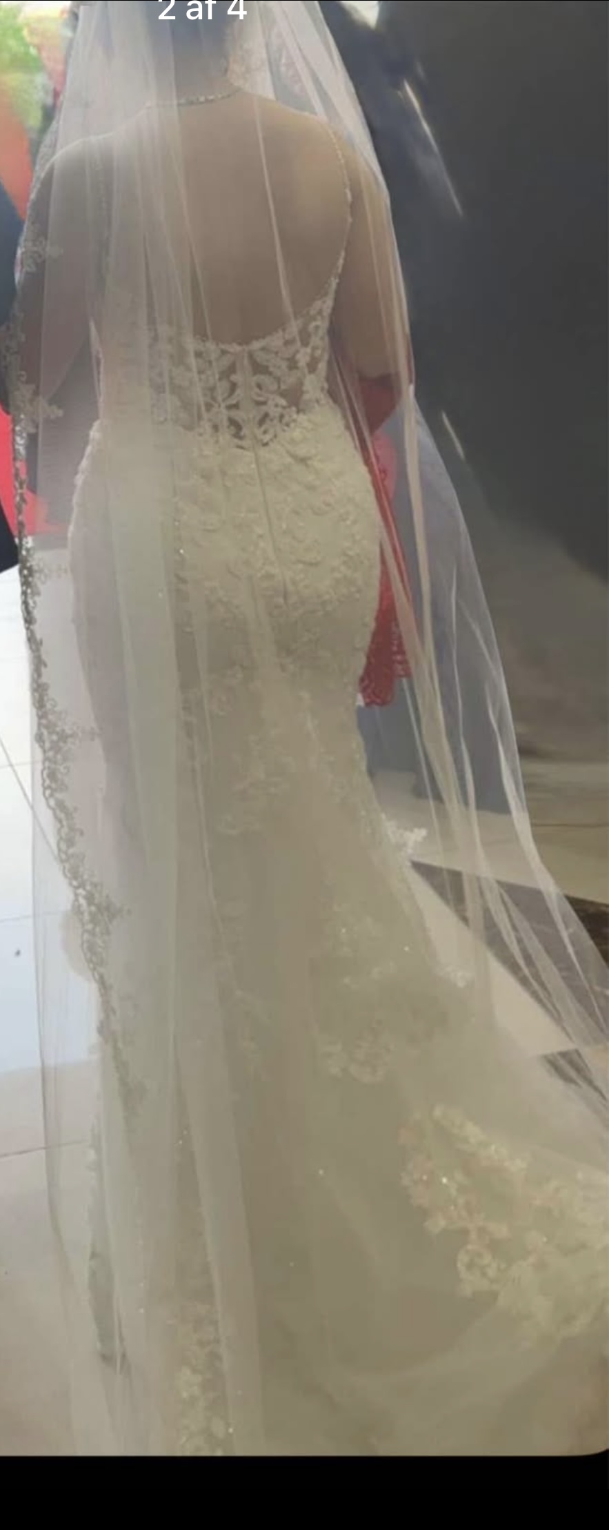 Brudekjole + slør sælges (samlet). Størrelse: 38. Er syet lidt ind. Jeg er 165 cm høj og havde stiletter med 6 cm hælhøjde Kan prøves og afhentes i Hvidovre. Nypris 17.000kr. Brudekjole brugt i 4 timer – til slut henna fest/afhentning af brud. ...
