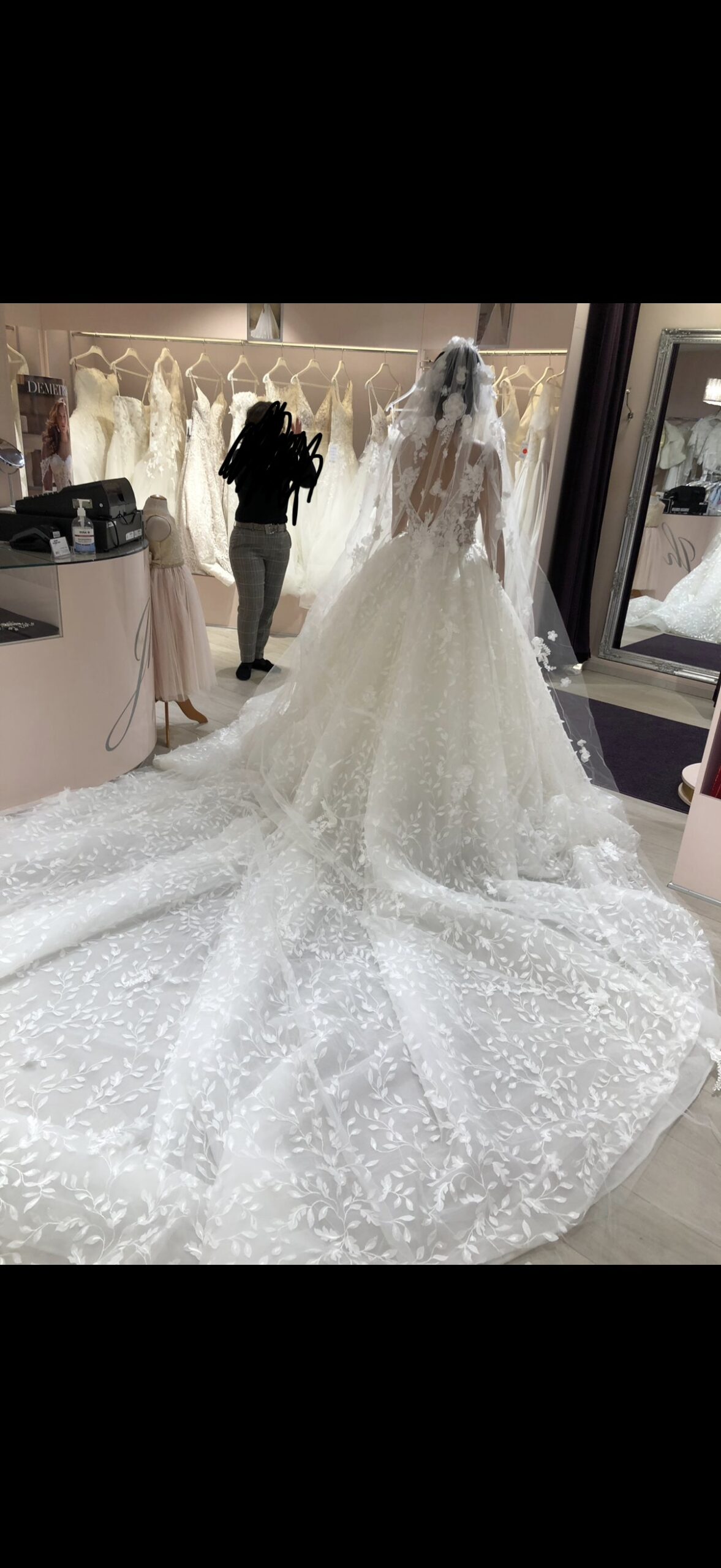 Smuk Demetrios brudekjole sælges – skræddersyet i Italien, str. 34. Inkluderer et unikt, håndlavet slør på 5 meter.
