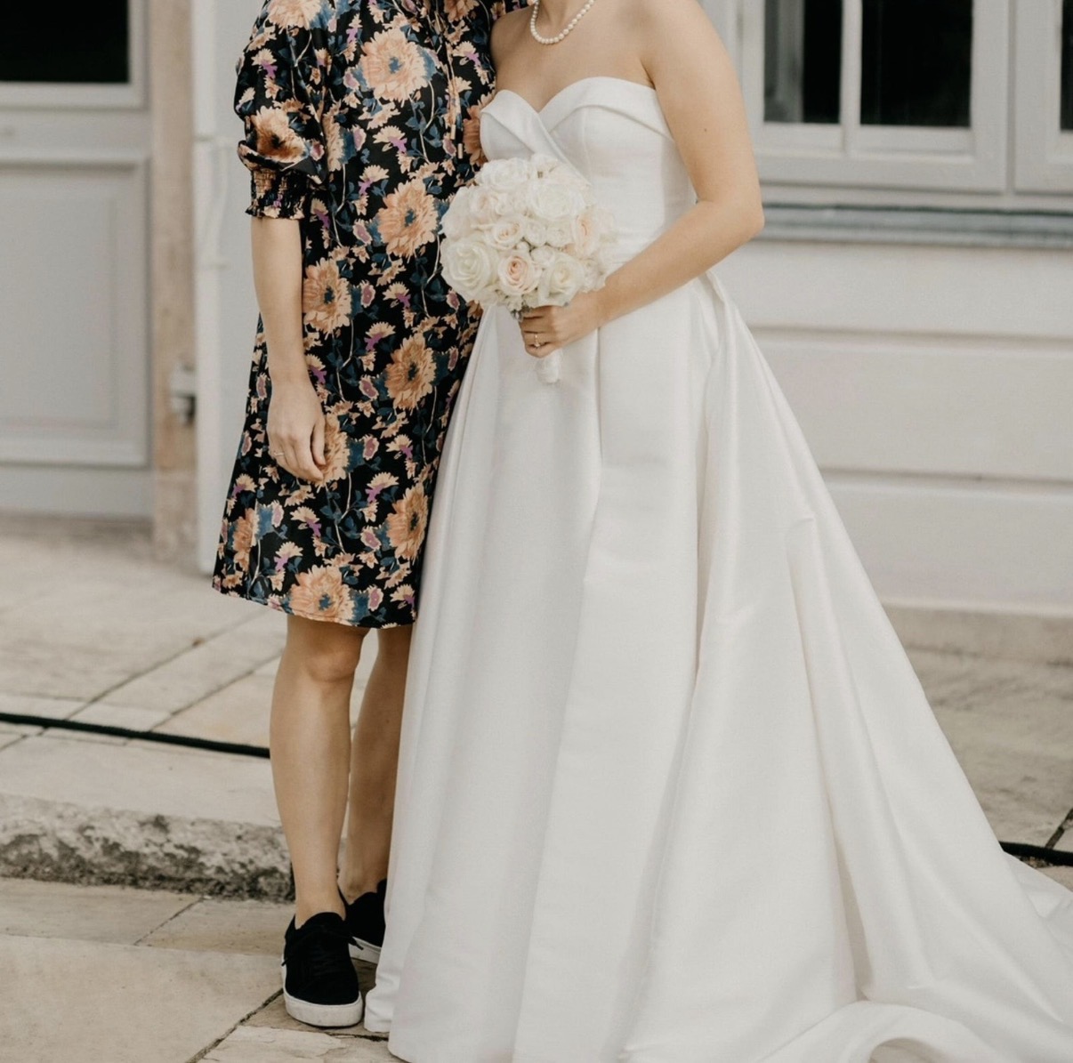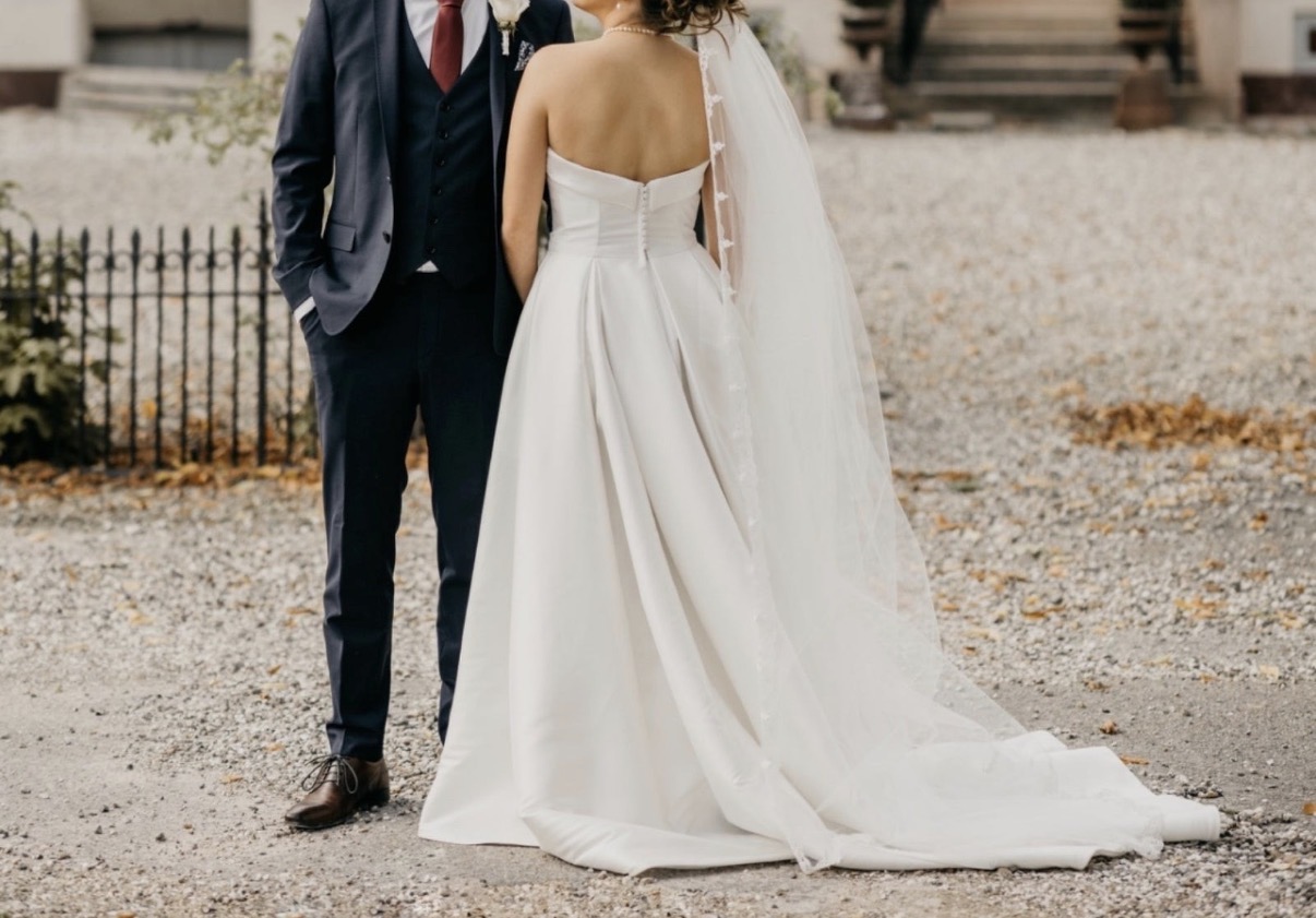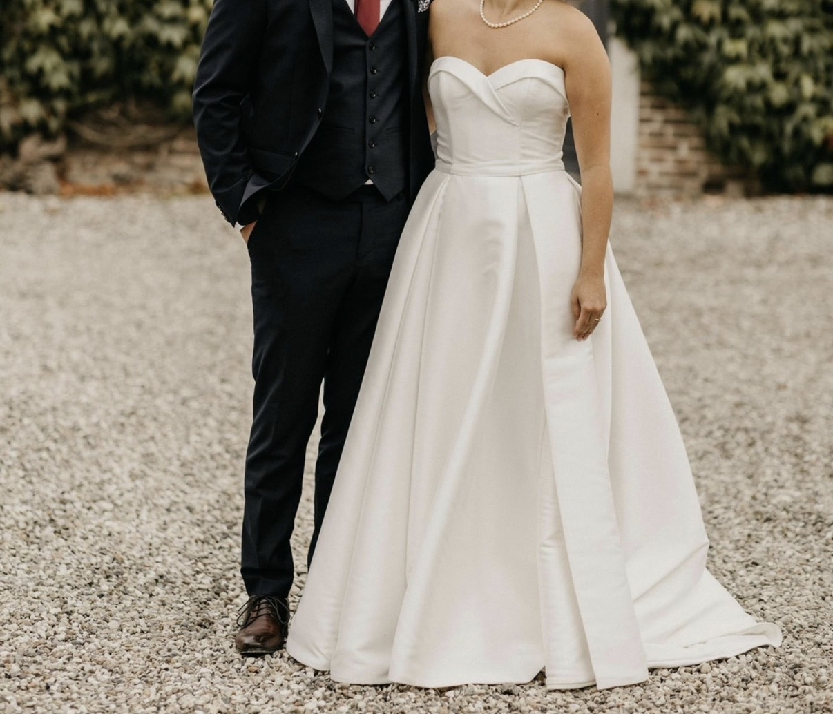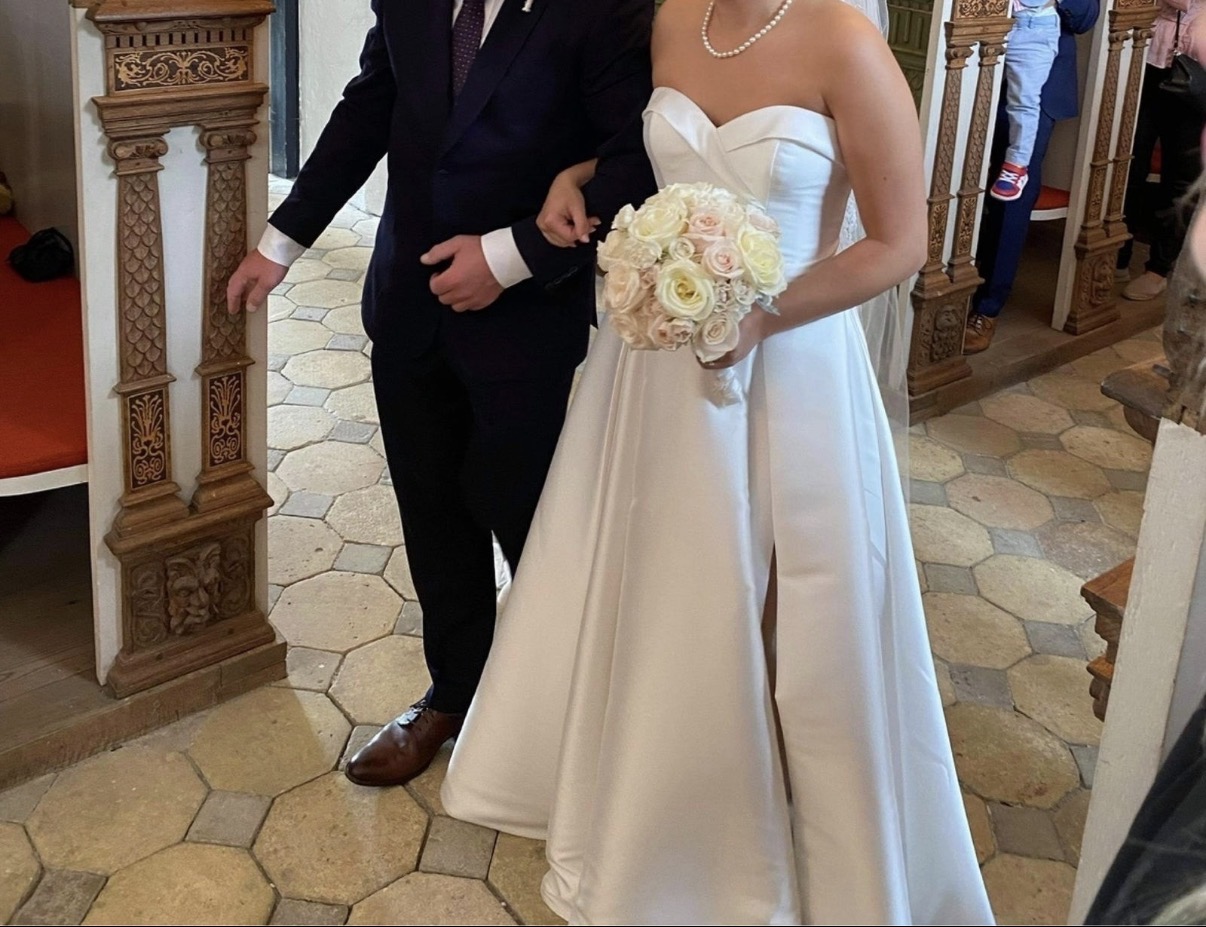 Brudekjole, str. M, Næsten som ny, Smuk brudekjole uden ærmer, med diskret korset og slids langs venstre ben sælges. Kjolen har lommer og giver et super elegant snit Købt for 10.000 kr. i sin tid. Sælges for 3000 kr. Lad mig endelig vide, hvis du er interesseret og har nogen spørgsmål.