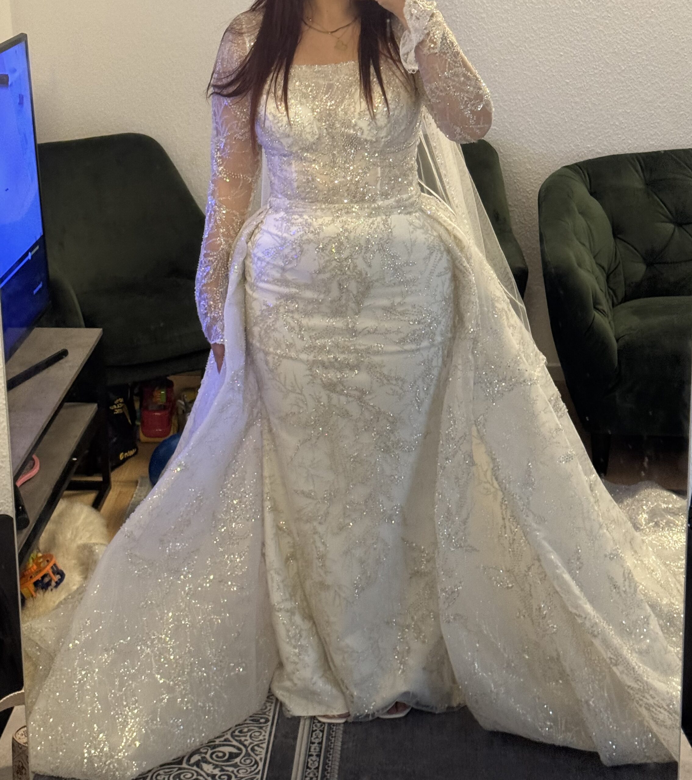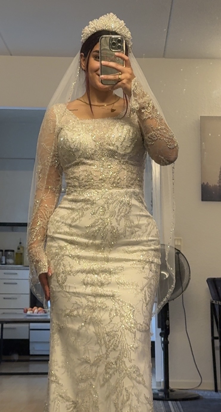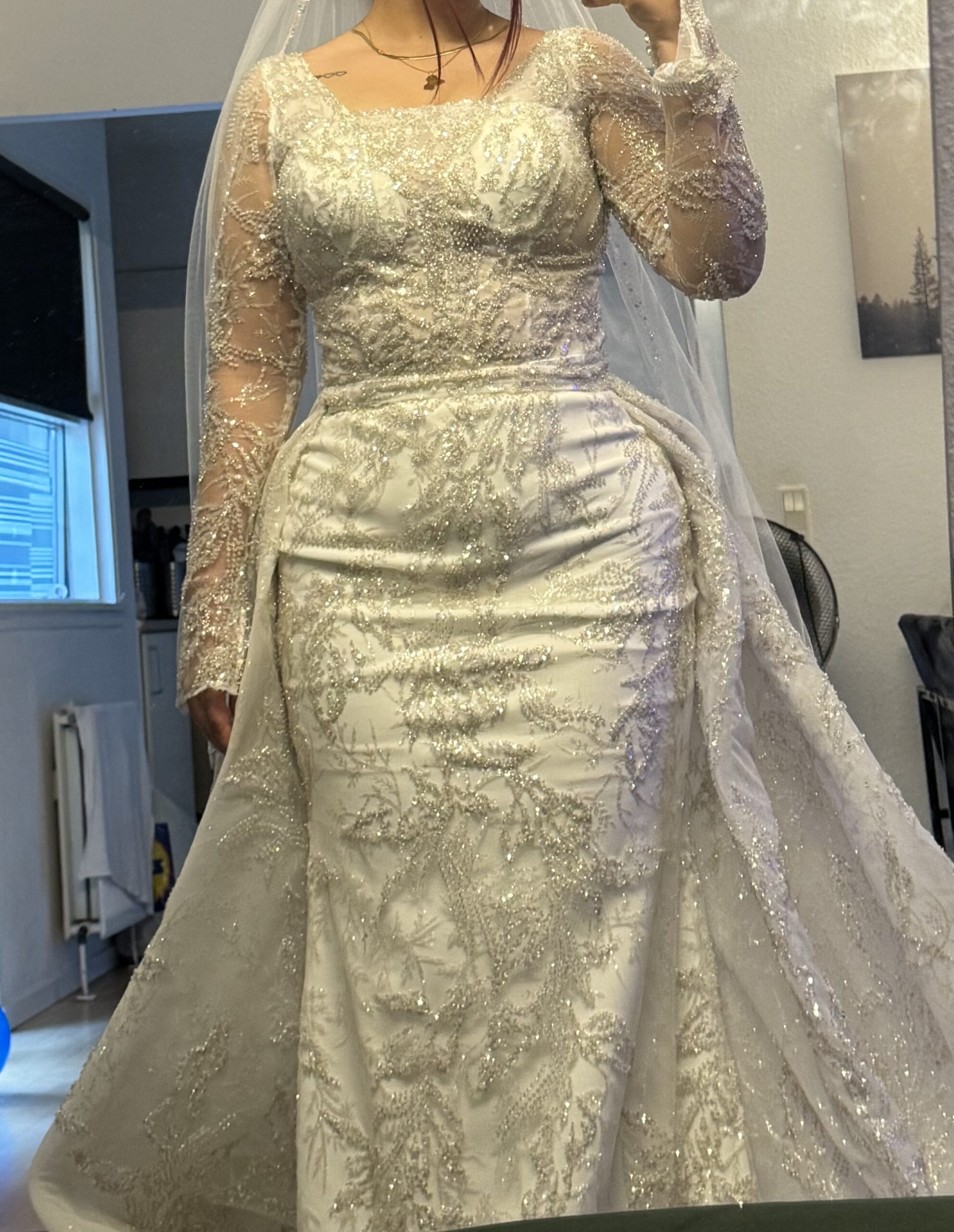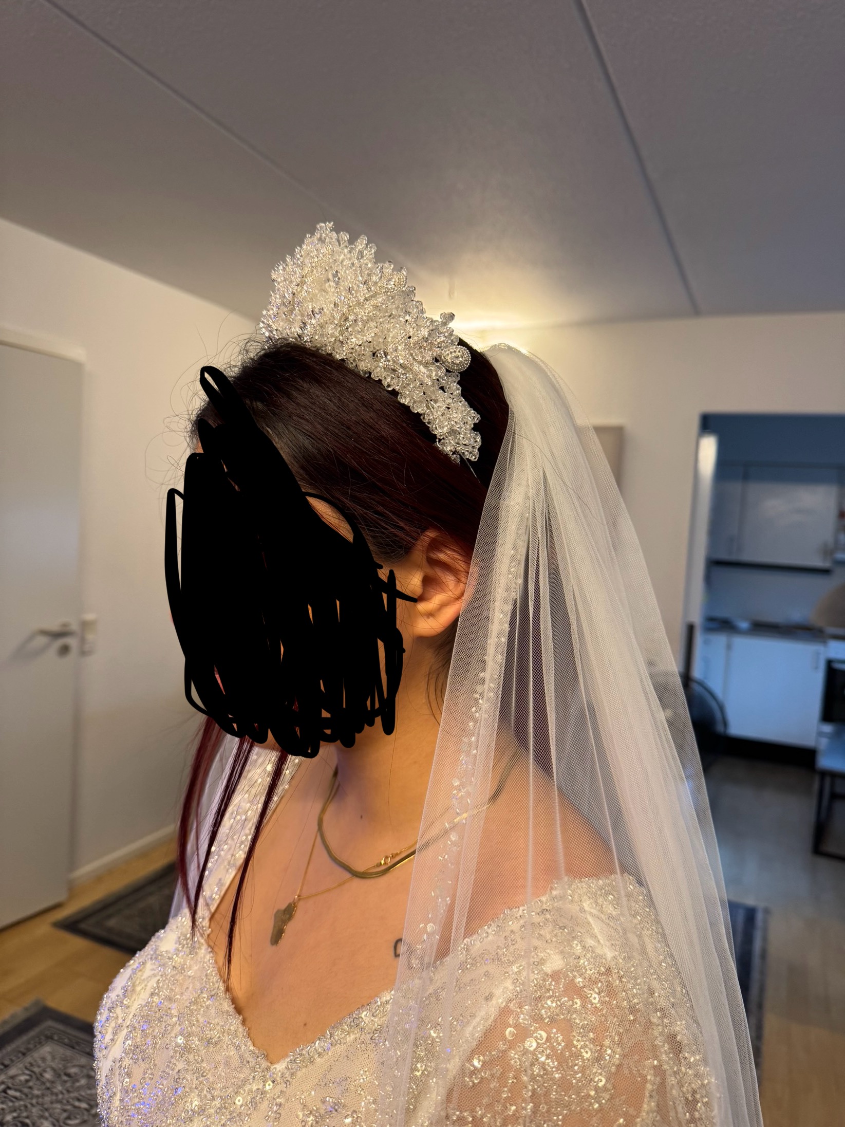Sælger en smuk brudekjole, den er aldrig blevet brugt. Det er en to-dele kjole. Der er også slør med og krone.