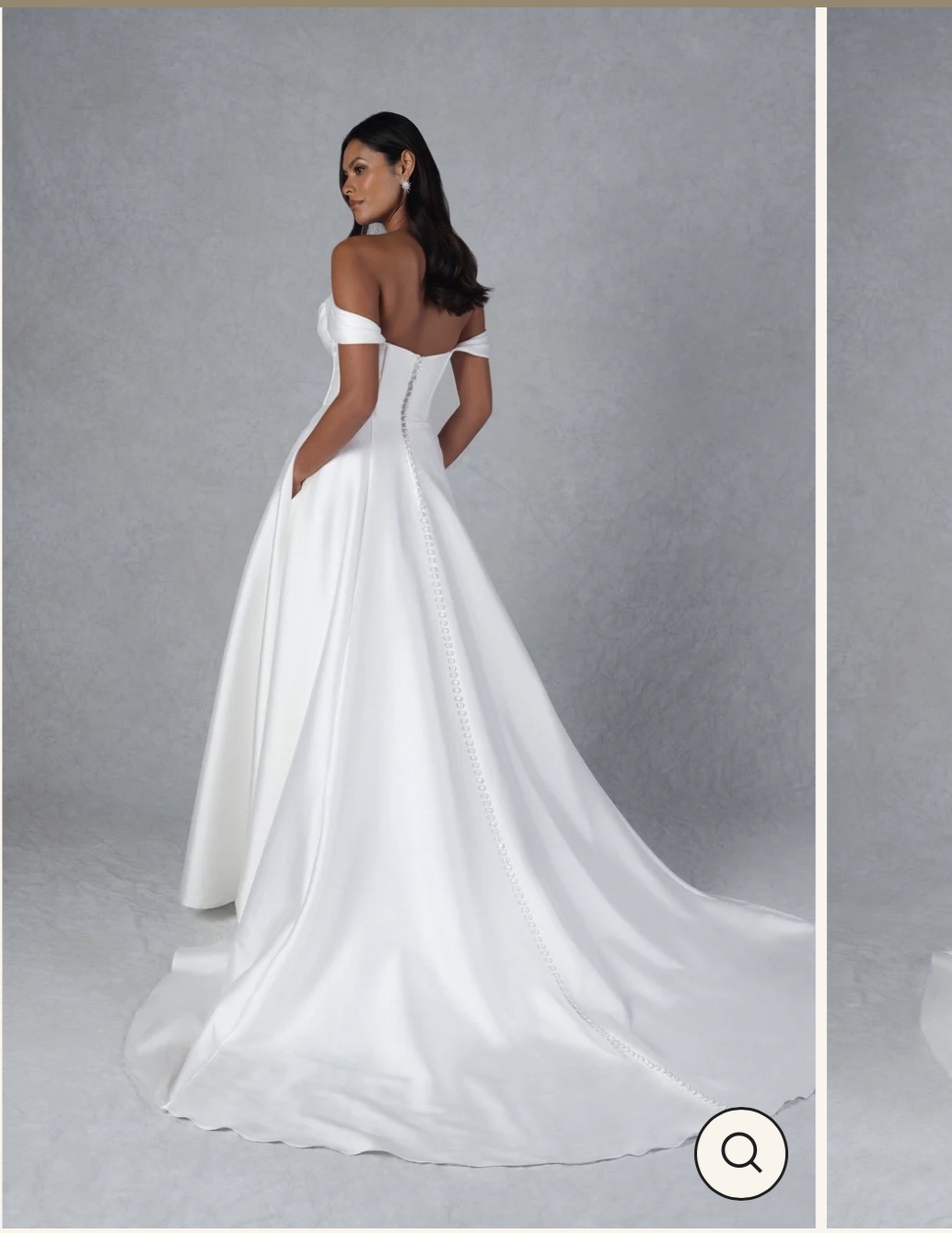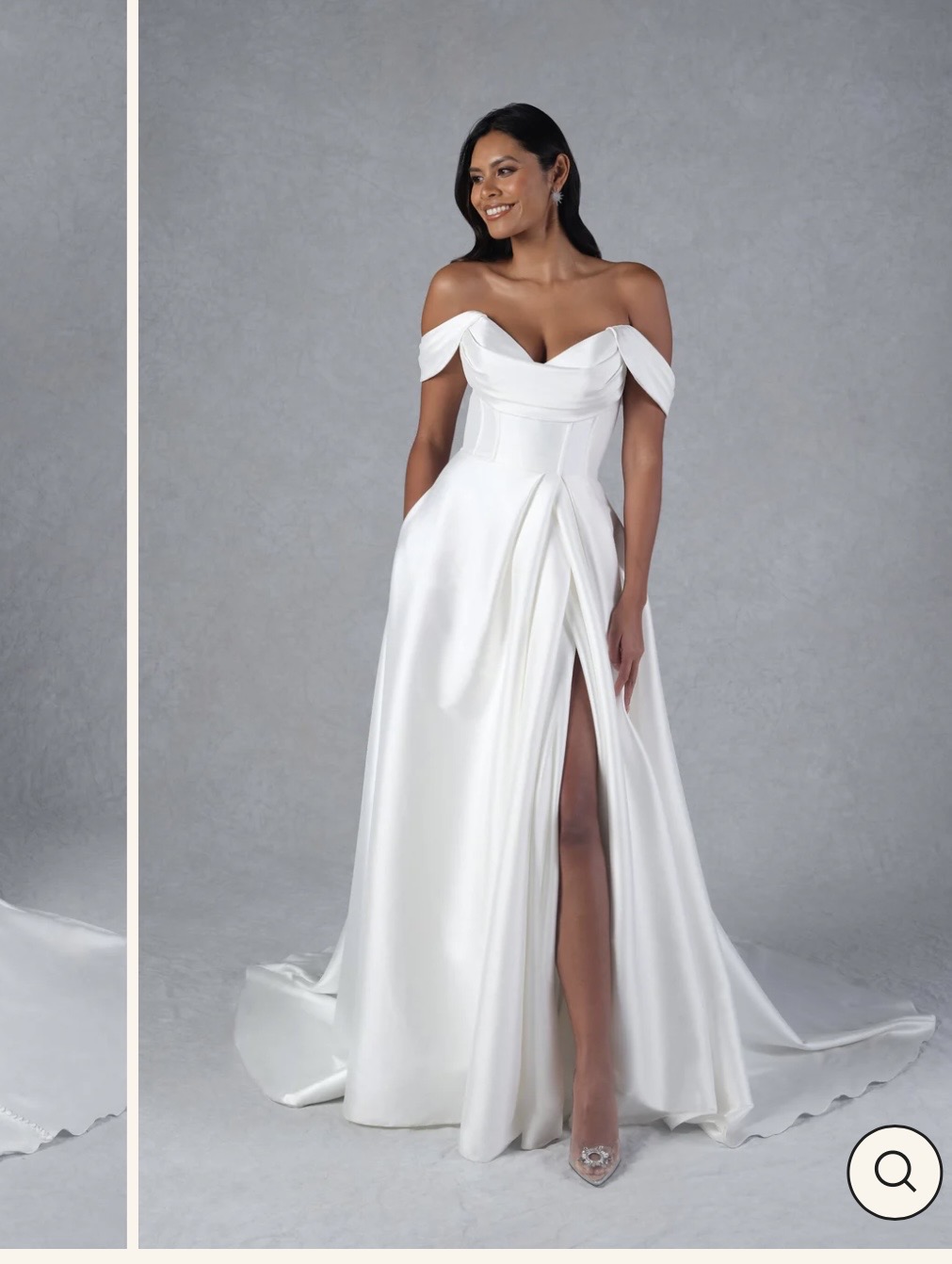 Elegant og stilren brudekjole i tungt satin og med slids i siden. Kjolen har en korset som fremhæver taljen samt elegant drapering ved brystet. Den har et slæb med knapper hele vejen ned langs ryg og slæb. Den kommer derudover med aftagelige stropper.